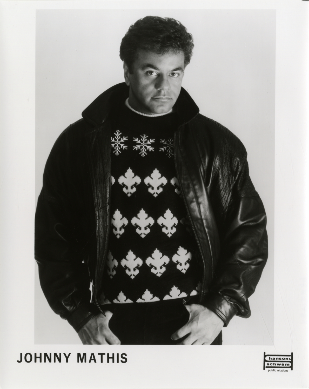 Portrait of singer Johnny Mathis. Printed on front: "Johnny Mathis. Hanson & Schwam, public relations."