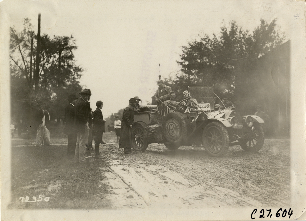 View of spectators approaching motorists in Chalmers car on dirt road during the 1911 Good Roads Tour sponsored by the Touring Club of America. The tour covered a route from Atlanta, Georgia to Richmond, Virginia. Stamped on back: "Spooner & Wells, Inc., photographers, telephones 3472-3473 Columbus, 1931 Broadway, New York." Handwritten on back: "Tours--Touring Club of America tour, 1911."