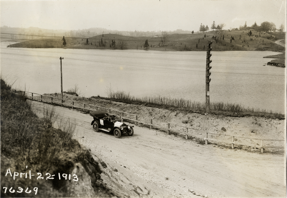 View of motorists in National car on road next to river during the 1913 Overman tires 10,000 mile demonstration. The car was outfitted with a set of Overman cushion tires and driven over different routes and road surfaces within a 50 mile radius of New York, New York. Printed on front: "April-22-1913." Stamped on back: "Spooner & Wells, Inc., photographers, 1931 Broadway, N.Y. City, phones 3472-3473 Col." Handwritten on back: "Tours--Overman tires 10,000 mile demonstration, 1913."