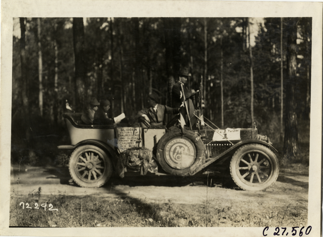 View of motorists in Chalmers car no. 1 on forest road during the 1911 Good Roads Tour sponsored by the Touring Club of America. The tour covered a route from Atlanta, Georgia to Richmond, Virginia. Stamped on back: "Spooner & Wells, Inc., photographers, telephones 3472-3473 Columbus, 1931 Broadway, New York." Handwritten on back: "Tours--Touring Club of America tour, 1911."
