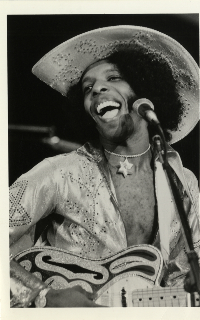Portrait of Sly Stone, member of the musical group Sly and the Family Stone. Handwritten on back: "Sly (and the Family Stone)."