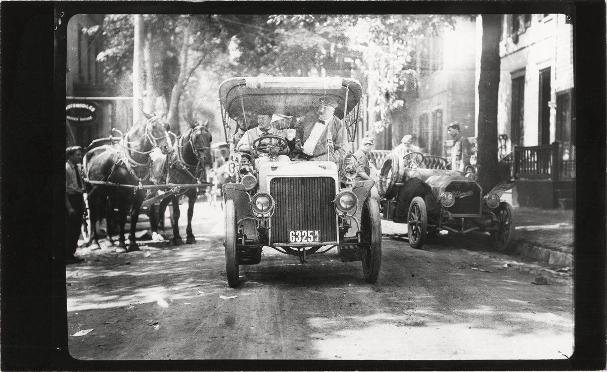 View of motorists in 1906 White Steamer car. Oldsmobile car and horse-drawn wagon in background. Handwritten on back: "White, 1906."
