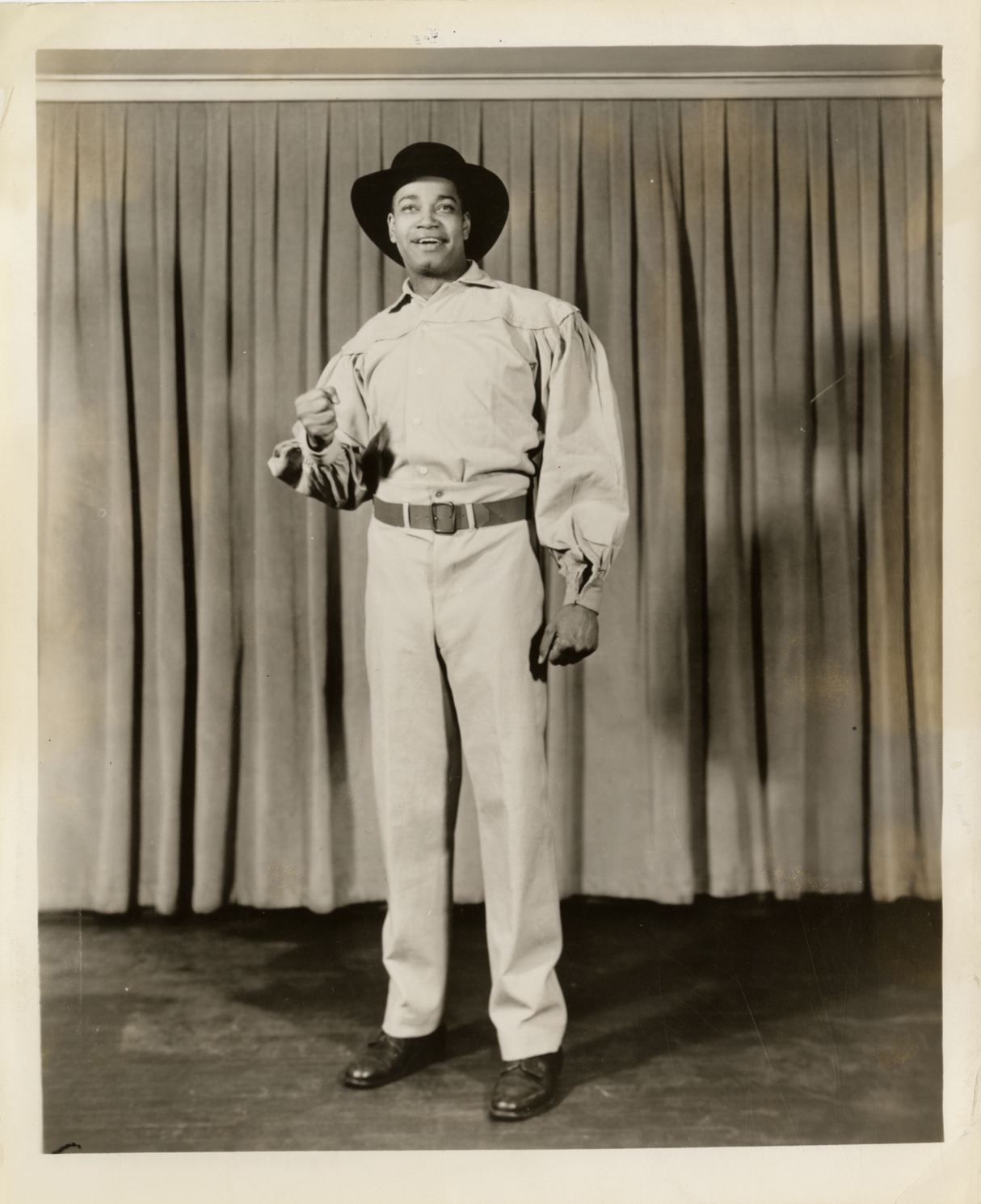 Portrait of actor Kenneth Spencer, in a scene from the musical, "Showboat." Handwritten on back: "Kenneth Spencer, Showboat."
