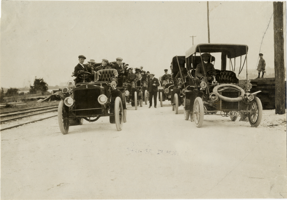 View of motorists in 1905 Model "E" White Steamer cars lined up in road. Stamped on back: "Photo by N. Lazarnick, 29 West 42nd Street, New York." Handwritten on back: "This was one of six cars that toured in Florida after the Ormond-Daytona races and just before leaving for the Cuba Race. The date was Feb. 2, 1906. White Steamer, 1905. Model E."