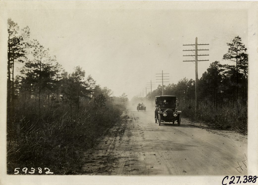 View of cars traveling on rural dirt road during the 1910 Quaker City Motor Club Roadability Run. The endurance contest covered a route from Philadelphia, Pennsylvania to Atlantic City, New Jersey. Stamped on back: "Spooner & Wells, Inc., photographers, telephones 3472-3473 Columbus, 1931 Broadway, New York." Handwritten on back: "Tours--Quaker City Motor Club Roadability Run, 1910."