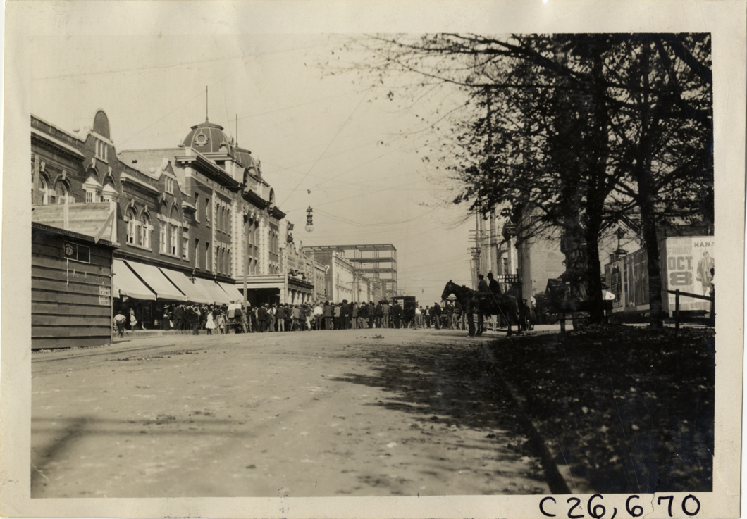 View of crowd of spectators surrounding cars in street at Salisbury, North Carolina during the 1909 New York to Atlanta Good Roads Tour. Men on horses on right; Meroney Theatre in background. Stamped on back: "Photo by Spooner & Wells, Inc. 1931 Broadway, N.Y." Handwritten on back: "Tours--New York-Atlanta Good Roads Tour, 1909."
