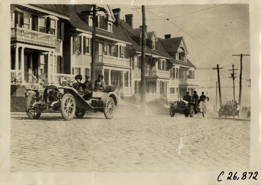 View of Joan Cuneo and passengers in Rainier press car, followed by other cars, during the 1909 New York to Atlanta Good Roads Tour. Houses in background. Handwritten on back: "Tours--New York-Atlanta Good Roads Tour, 1909."