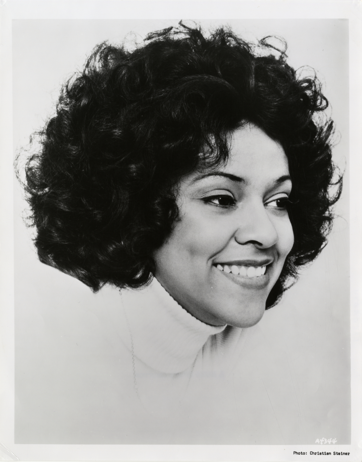 Portrait of soprano Kathleen Battle. Printed on front: "Photo: Christian Steiner." Label on back: "Kathleen Battle, soprano. Columbia Artists Management, Inc., 165 West 57th Street, N.Y.C. 10019."