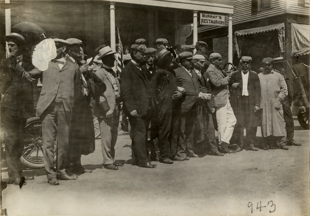 View of Secretary S.M. Butler, New Hampshire governor Nahum J. Bachelder and spectators at endurance run, Lancaster, New Hampshire, during the 1904 White Mountains tour. Murray's restaurant in background. The events included an endurance run in the White Mountains and the Climb to the Clouds Hill Climb on Mount Washington. Handwritten on back: "[undecipherable] Butler, sec'y A.C.A. & Gov. Bachelder observing Wht. Mt. endurance run. Tours--White Mountains tour, 1904."