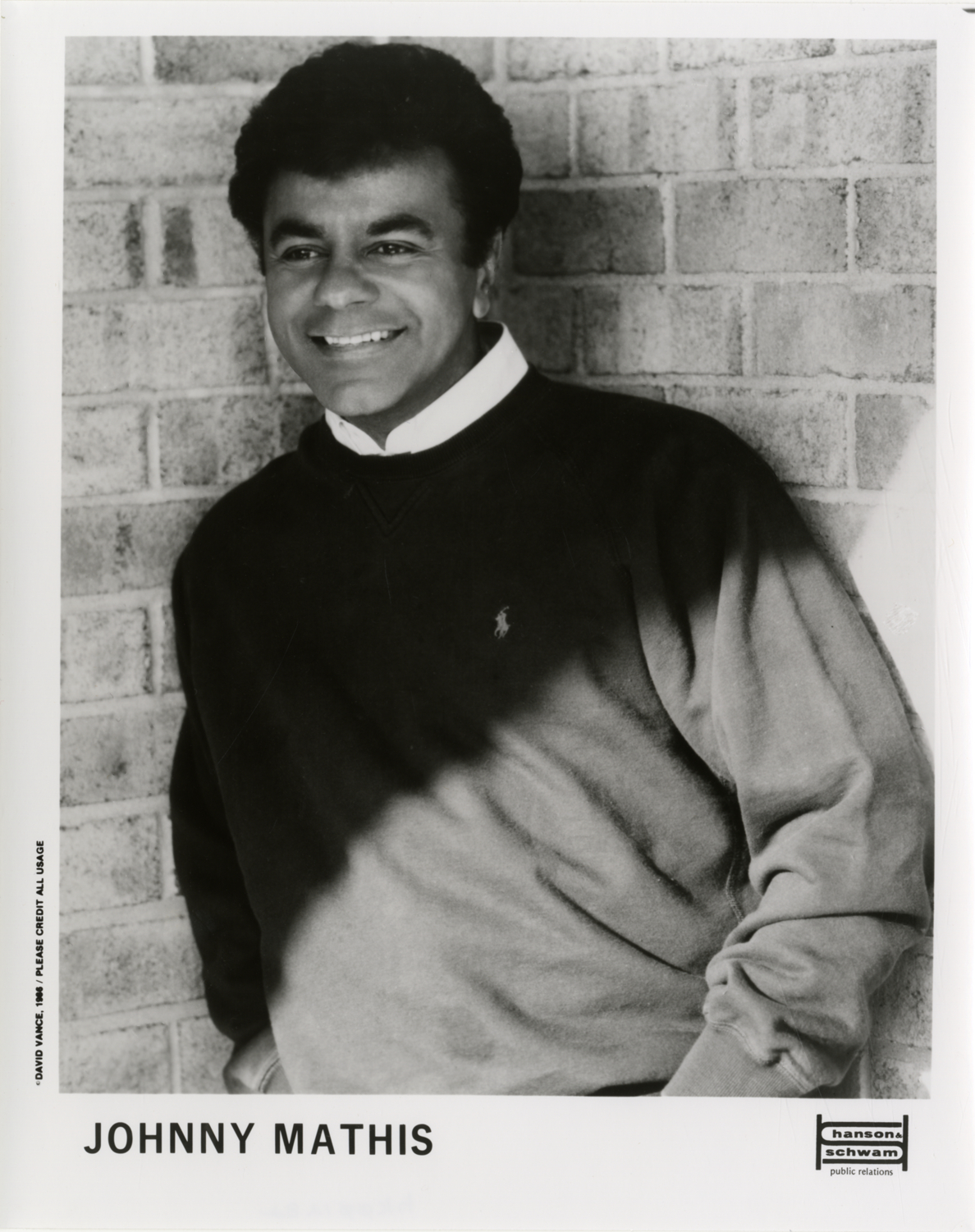 Portrait of singer Johnny Mathis. Printed on front: "Johnny Mathis. Hanson & Schwam, public relations. David Vance, 1986. Please credit all usage."