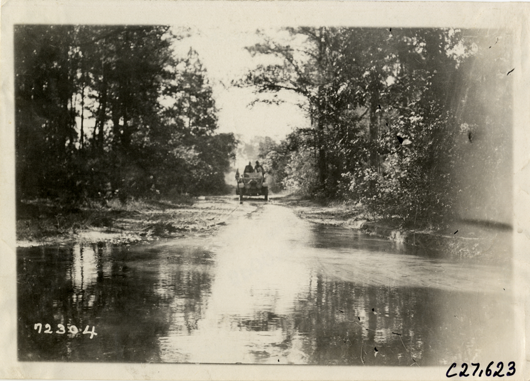 Automobile approaching flooded stretch of road, 1911 Touring Club of America Good Roads Tour