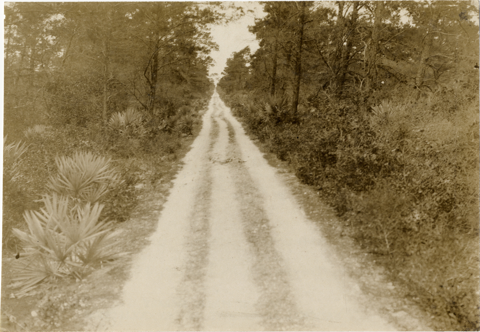 View of rural dirt road in Florida. Stamped on back: "Photo by N. Lazarnick, 29 West 42nd Street, New York." Handwritten on back: "This was one of six cars that toured in Florida after the Ormond-Daytona races and just before leaving for the Cuba Race. The date was Feb. 2, 1906. White Steamer, 1905. Model E."