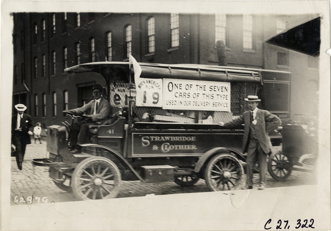 View of motorists in Autocar truck no. 19, owned by Strawbridge & Clothier, at Philadelphia, Pennsylvania during the 1910 North American Run. Sign on truck reads: "One of the seven cars of this type used in our delivery service." The reliability contest for commercial vehicles covered a route from Philadelphia to Atlantic City. Stamped on back: "Spooner & Wells, Inc., photographers, telephones 3472-3473 Columbus, 1931 Broadway, New York." Handwritten on back: "Autocar truck at Phila. Tours--North American Run, 1910."