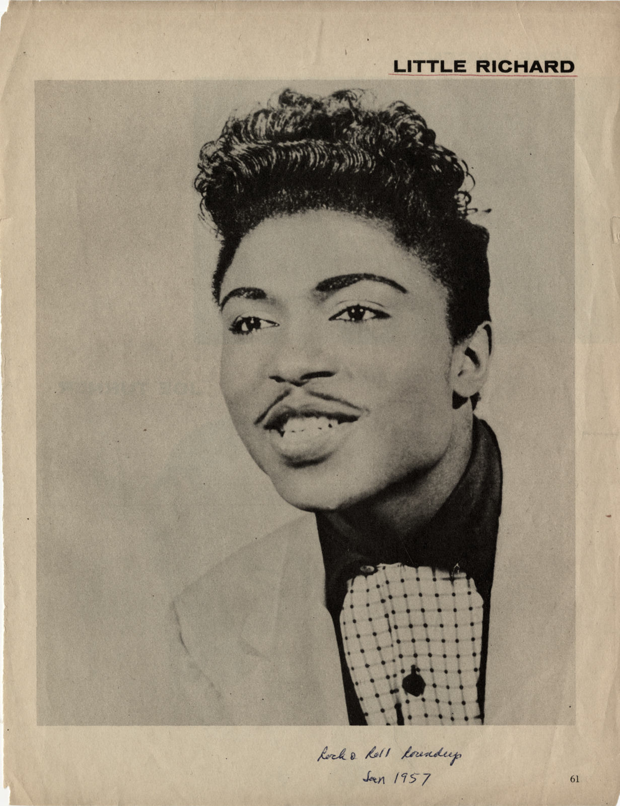 Portrait of singer Little Richard. Printed on front: "Little Richard." Handwritten on front: "Rock & Roll Roundup, Jan. 1957."