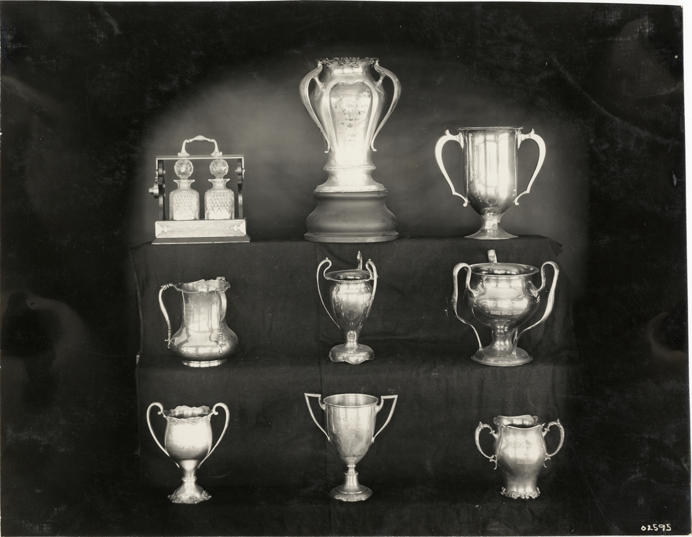 View of display of trophy cups won by the Ford Motor Company. Handwritten on back: "Ford trophies. Trophies, Ford Motor Co., 1911."
