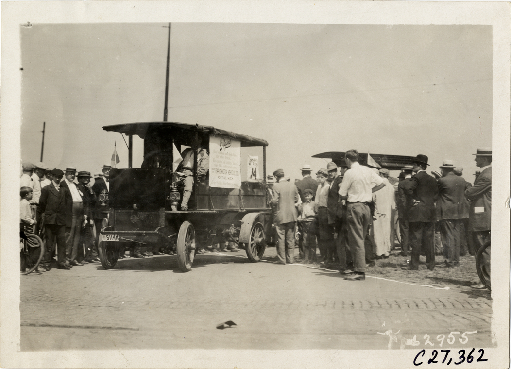 View of spectators surrounding motorists in Rapid truck no. 14 during the 1910 North American Run. The reliability contest for commercial vehicles covered a route from Philadelphia to Atlantic City. Stamped on back: "Spooner & Wells, Inc., photographers, telephones 3472-3473 Columbus, 1931 Broadway, New York." Handwritten on back: "Tours--North American Run, 1910."