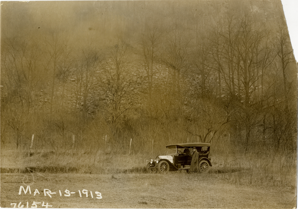 View of motorists in National car traveling on forest road during the 1913 Overman tires 10,000 mile demonstration. The car was outfitted with a set of Overman cushion tires and driven over different routes and road surfaces within a 50 mile radius of New York, New York. Printed on front: "Mar-13-1913." Stamped on back: "Spooner & Wells, Inc., photographers, 1931 Broadway, N.Y. City, phones 3472-3473 Col." Handwritten on back: "Tours--Overman tires 10,000 mile demonstration, 1913."