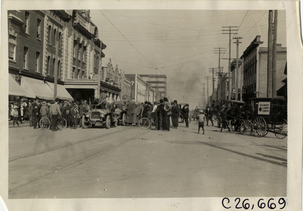 View of crowd of spectators surrounding cars in street at Salisbury, North Carolina during the 1909 New York to Atlanta Good Roads Tour. Horse-drawn wagon for Salisbury Laundry Company on right. Stamped on back: "Photo by Spooner & Wells, Inc. 1931 Broadway, N.Y." Handwritten on back: "Tours--New York-Atlanta Good Roads Tour, 1909."