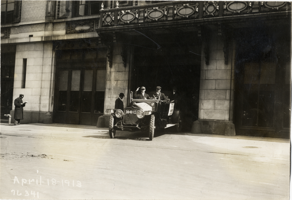 View of motorists in National car exiting garage during the 1913 Overman tires 10,000 mile demonstration. The car was outfitted with a set of Overman cushion tires and driven over different routes and road surfaces within a 50 mile radius of New York, New York. Printed on front: "April-18-1913." Handwritten on back: "Tours--Overman tires 10,000 mile demonstration, 1913."