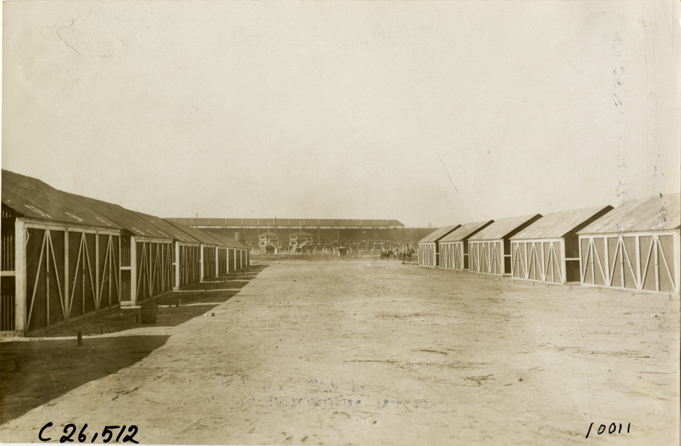 View of garages at Atlanta Speedway in Georgia during the 1909 New York to Atlanta Good Roads Tour. Grandstand in background. Handwritten on back: "Stop at the Speedway. Tours--New York-Atlanta Good Roads Tour, 1909."