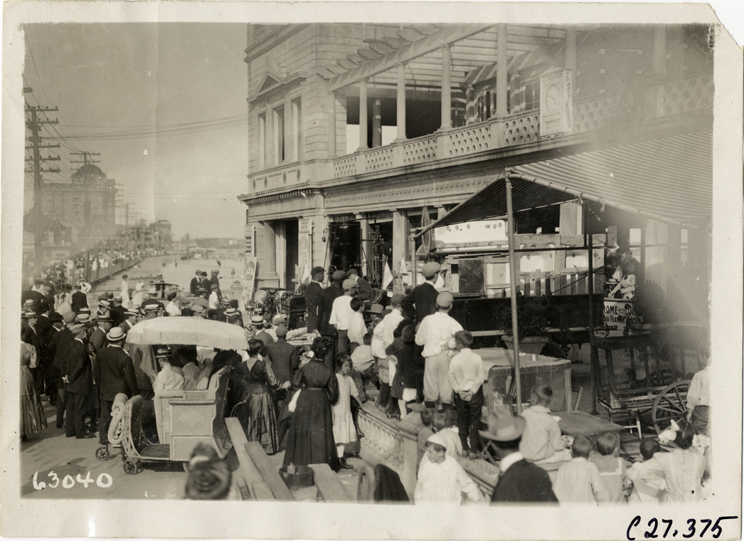 View of crowd in street at Atlantic City during the 1910 North American Run. Wicker wheeled chair with fringed top in foreground. The reliability contest for commercial vehicles covered a route from Philadelphia to Atlantic City. Stamped on back: "Spooner & Wells, Inc., photographers, telephones 3472-3473 Columbus, 1931 Broadway, New York." Handwritten on back: "General view at Atlantic City. Tours--North American Run, 1910."