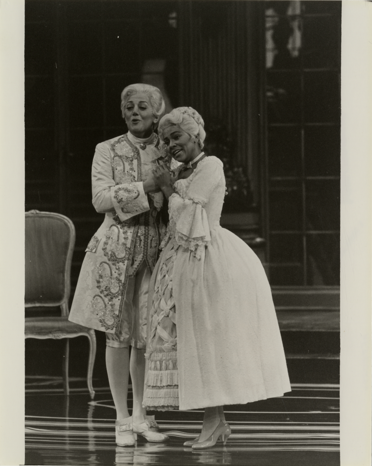 View of soprano Kathleen Battle and mezzo-soprano Tatiana Troyanos in a scene from Strauss' "Der Rosenkavalier." Typed on back: "James Heffernan." Label on back: "Press Department, Metropolitan Opera, Lincoln Center, New York City 10023. Tatiana Troyanos as Octavian and Kathleen Battle as Sophie in Act II of Strauss' 'Der Rosenkavalier.'"