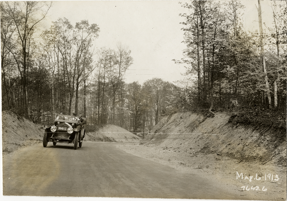 View of motorists in National car traveling on rural dirt road during the 1913 Overman tires 10,000 mile demonstration. The car was outfitted with a set of Overman cushion tires and driven over different routes and road surfaces within a 50 mile radius of New York, New York. Printed on front: "May-6-1913." Stamped on back: "Spooner & Wells, Inc., photographers, 1931 Broadway, N.Y. City, phones 3472-3473 Col." Handwritten on back: "Tours--Overman tires 10,000 mile demonstration, 1913."