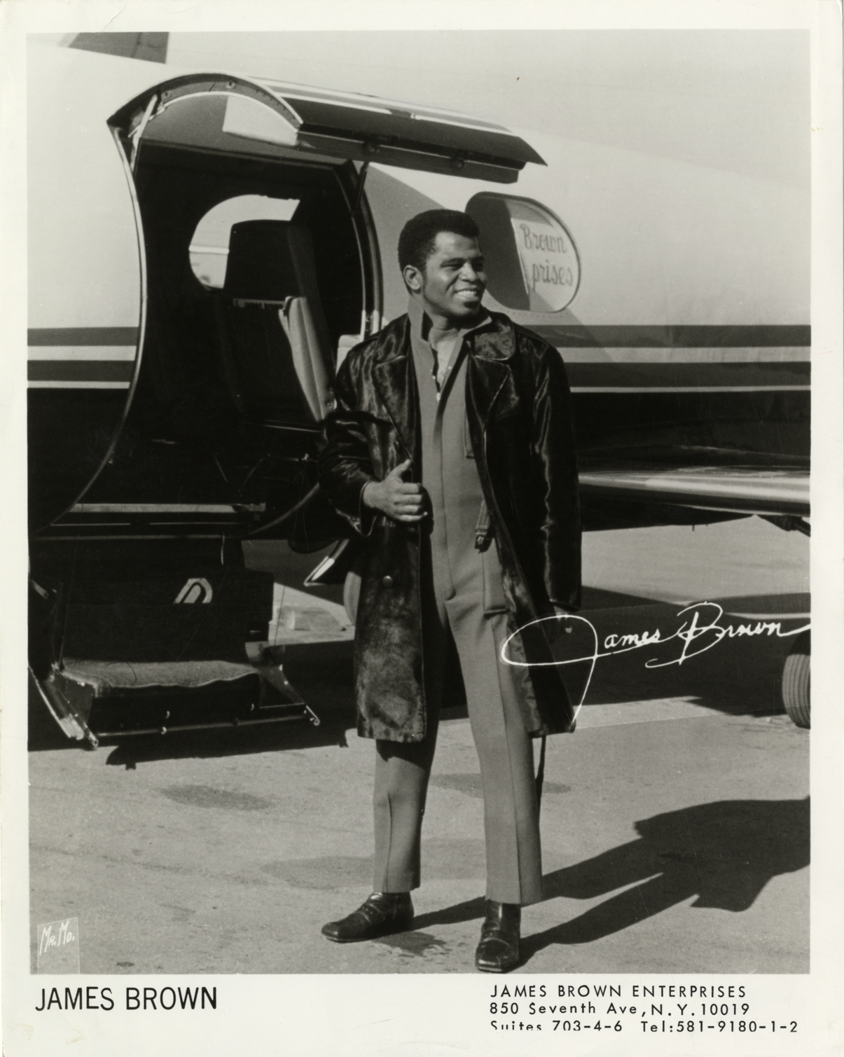 View of singer James Brown standing in front of airplane. Printed on front: "James Brown. James Brown Enterprises, 850 Seventh Ave, N.Y. 10019, Suites 703-4-6, tel: 581-9180-1-2. Mr. Mo." Signature of James Brown printed on front.