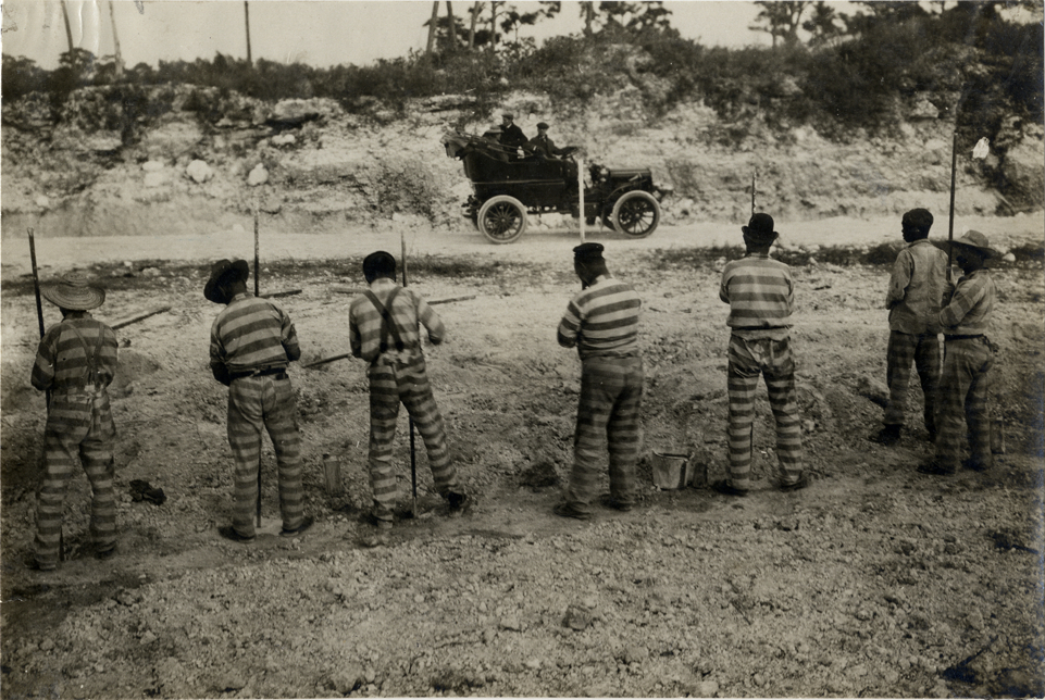 View of convicts, wearing striped uniforms, working with shovels during road construction project in Florida. Motorists in 1905 Model E White Steamer car watch from road. Handwritten on back: "This was one of six cars that toured in Florida after the Ormond-Daytona races and just before leaving for the Cuba Race. The date was Feb. 2, 1906. White Steamer, 1905. Model E."