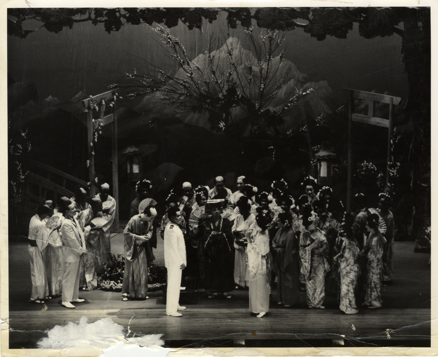 View of tenor George Shirley and cast in a performace of Puccini's opera, "Madame Butterfly." Handwritten on back: "Shirley, George."