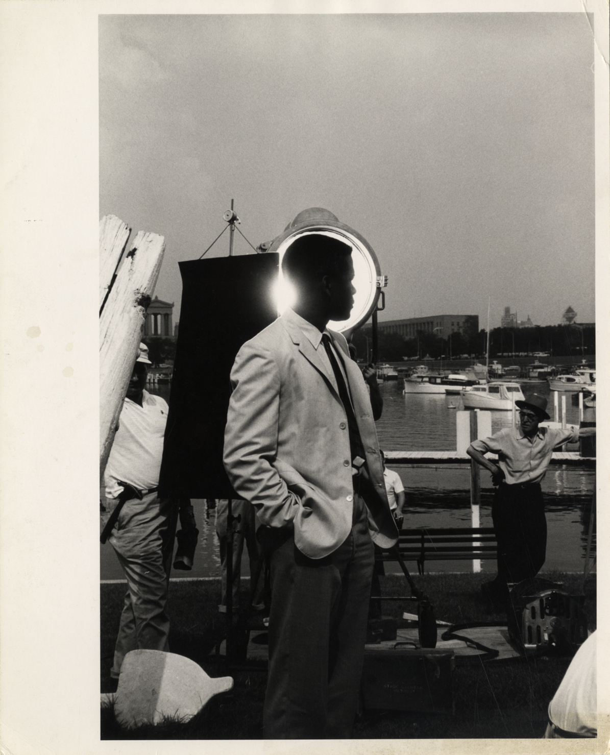 View of actor Sidney Poitier on motion picture set, standing near waterfront. Boats and crew members in background. Stamped on back: "Credit: Roy DeCarava, 1015 Sixth Avenue, NY 18 NY, WI 7-9556." Handwritten on back: "Sidney Poitier."