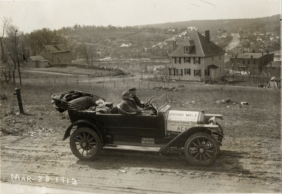 Motorists in National automobile on dirt road, 1913 Overman tires 10,000 mile demonstration