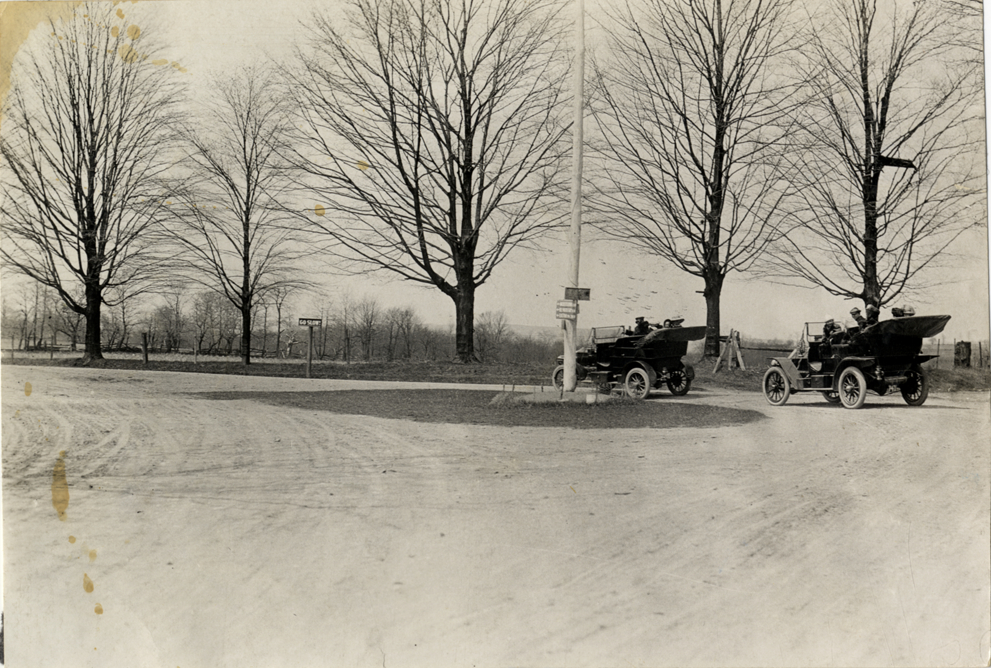 View of motorists in Marmon and Maxwell cars traveling on rural dirt road during the 1909 endurance run from Philadelphia to Wilkes-Barre, Pennsylvania. Sponsored by the Quaker City Motor Club, the contest followed a route through Pennsylvania and New Jersey. Stamped on back: "Spooner & Wells, Inc., photographers, telephones 3472-3473 Columbus, 1931 Broadway, New York." Handwritten on back: "[undecipherable] Roads Hotel. Maxwell and Marmon turning to left for Chester. Tours--Philadelphia to Wilkes-Barre, 1909."