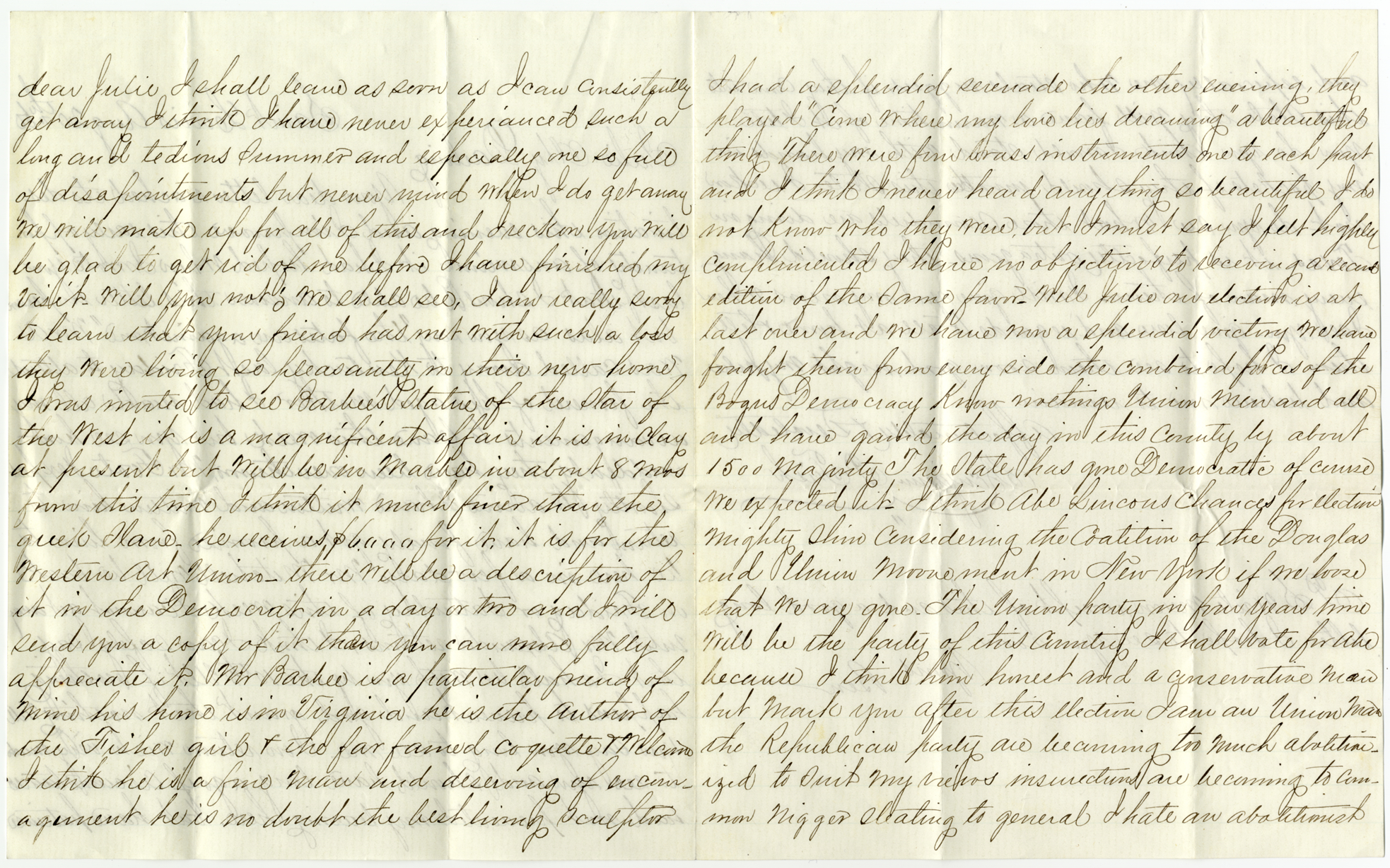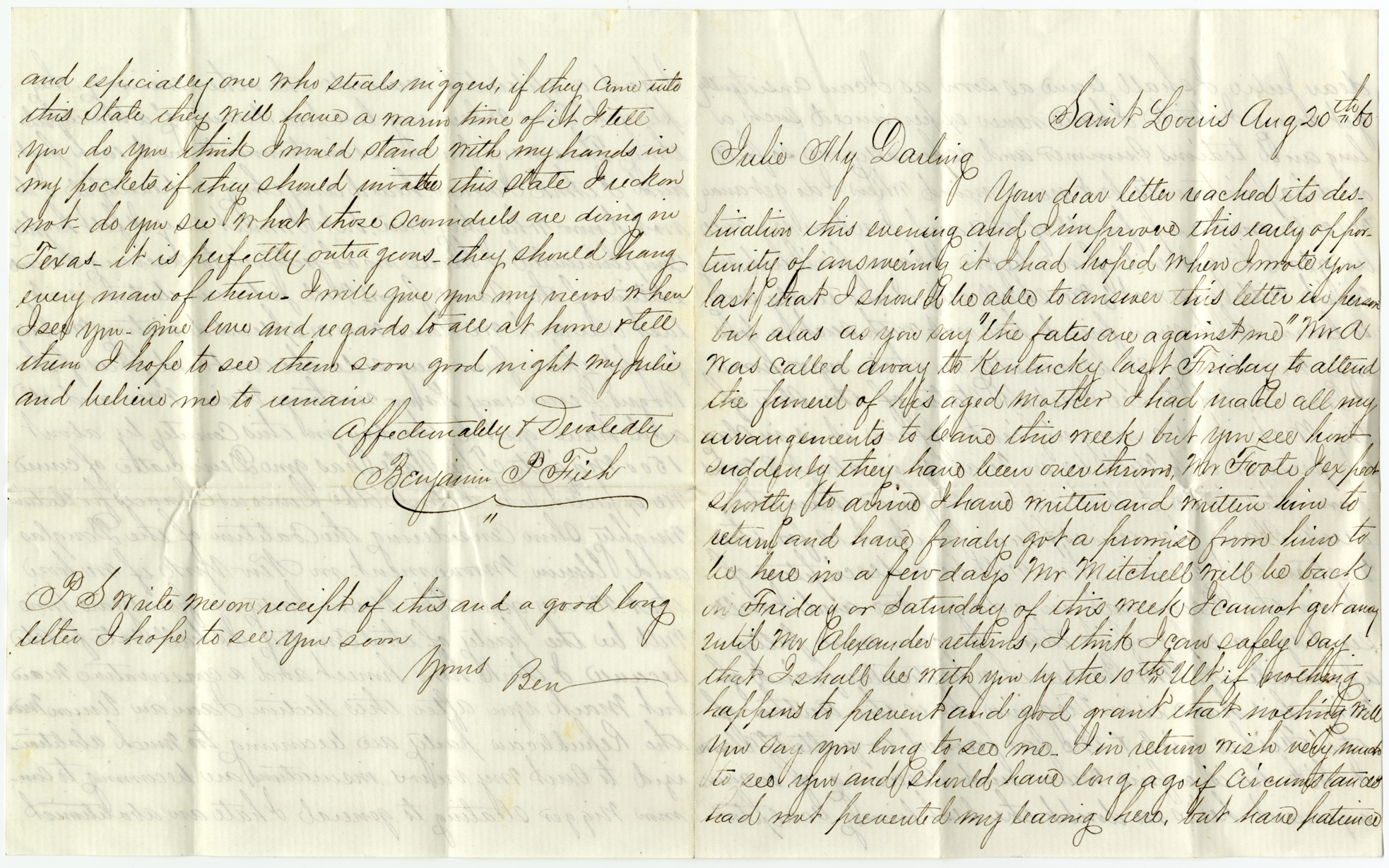 Letter to Julia Smith from Benjamin Fish discussing his views on Abraham Lincoln, the Union movement, abolitionists, and his plans to visit her in Detroit.