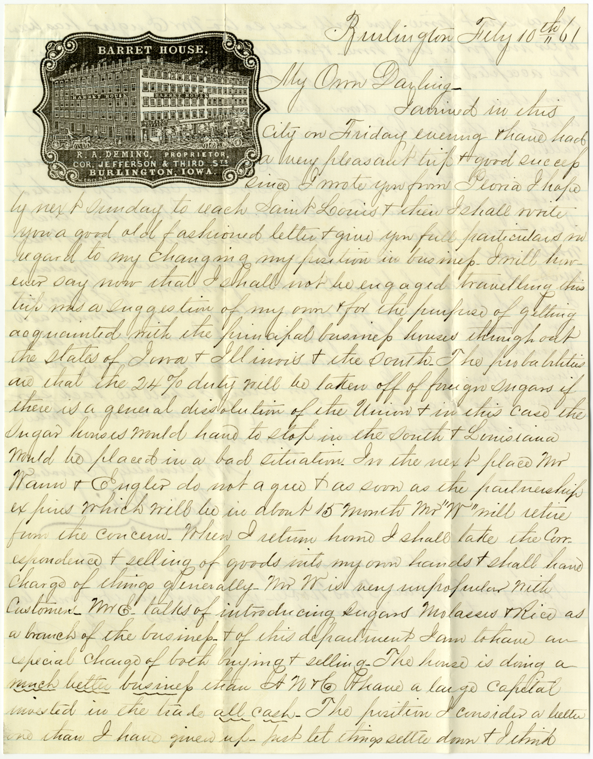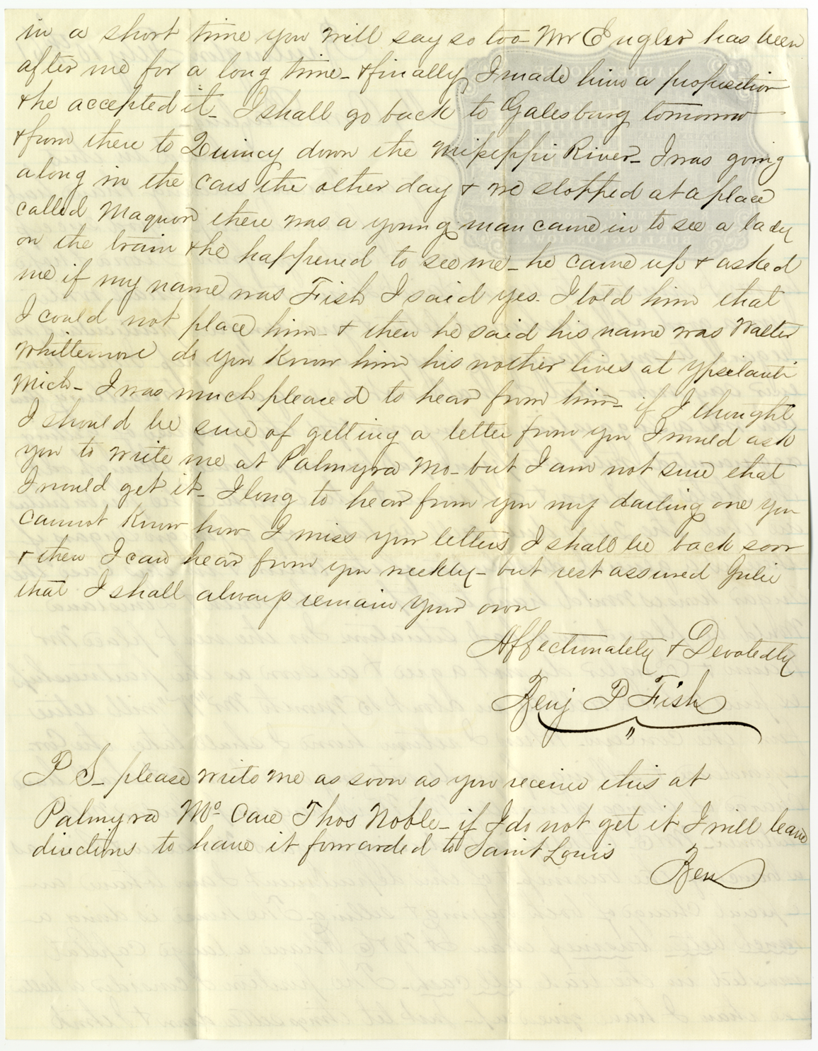 Letter to Julia Smith from Benjamin Fish discussing what is happening in his current job, a possible new job, and his business travel in the south.