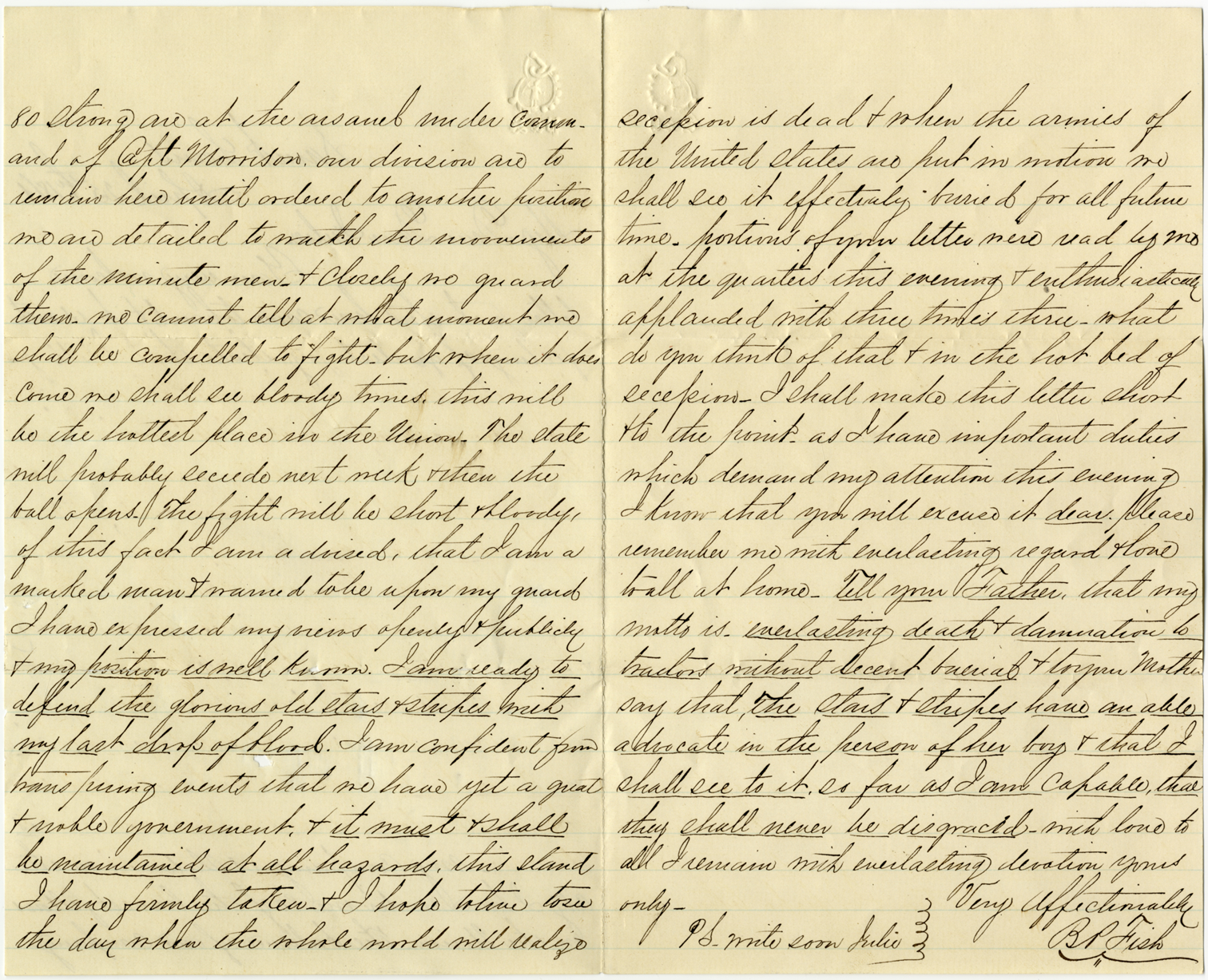Letter to Julia Smith from Benjamin Fish discussing his loyalty to the Union, and his willingness to die for his beliefs.
