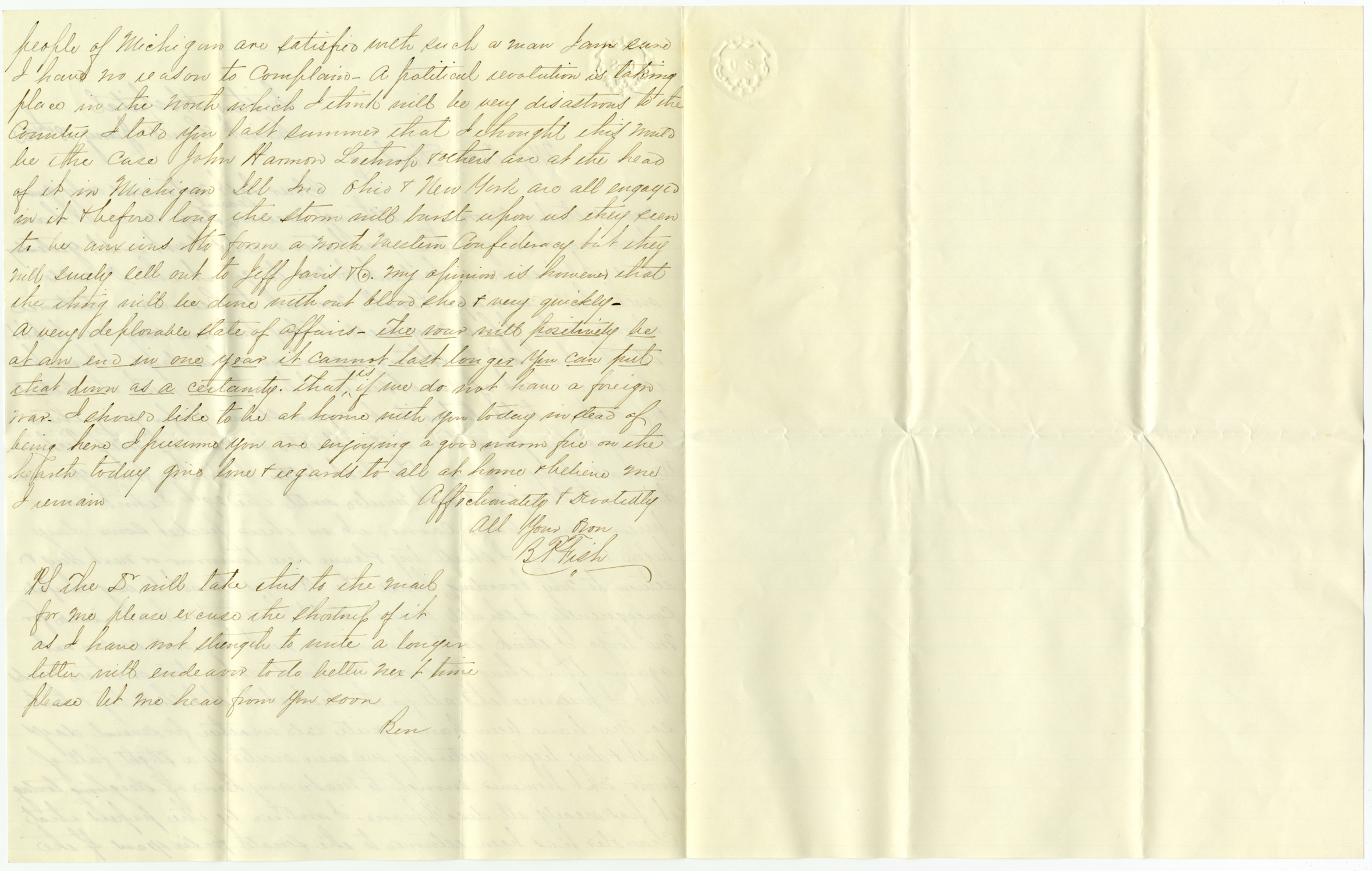 Letter to Julia Smith from Benjamin Fish discussing the political movement to form a Northwestern Confederancy.
