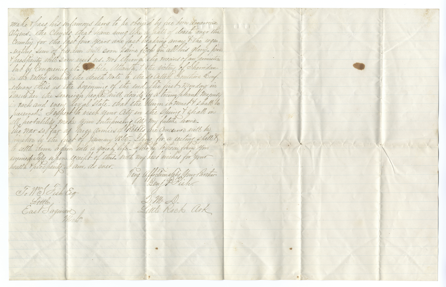 Letter from Benjamin Fish to his brother William S. Fish discussing the Civil War, the presidential election, the Copperhead movement and Jefferson Davis.