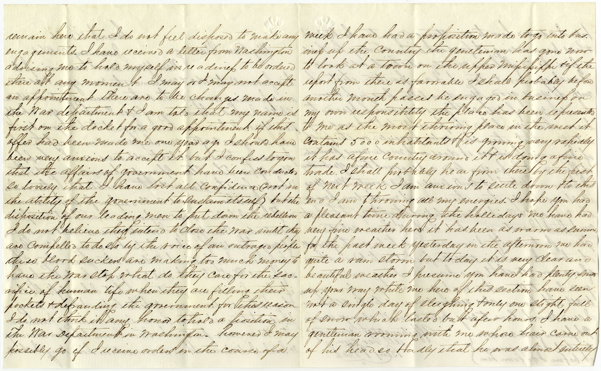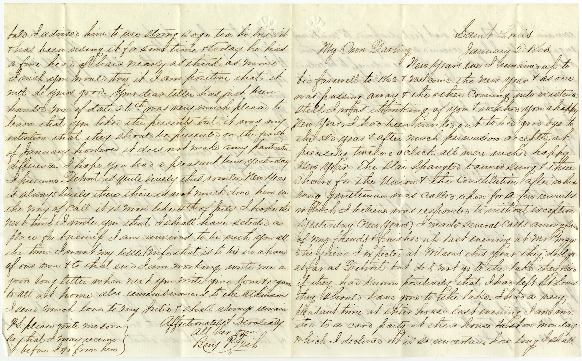 Letter to Julia Smith from Benjamin Fish discussing his possible assignment with the War Department, and a sage tea hair treatment.