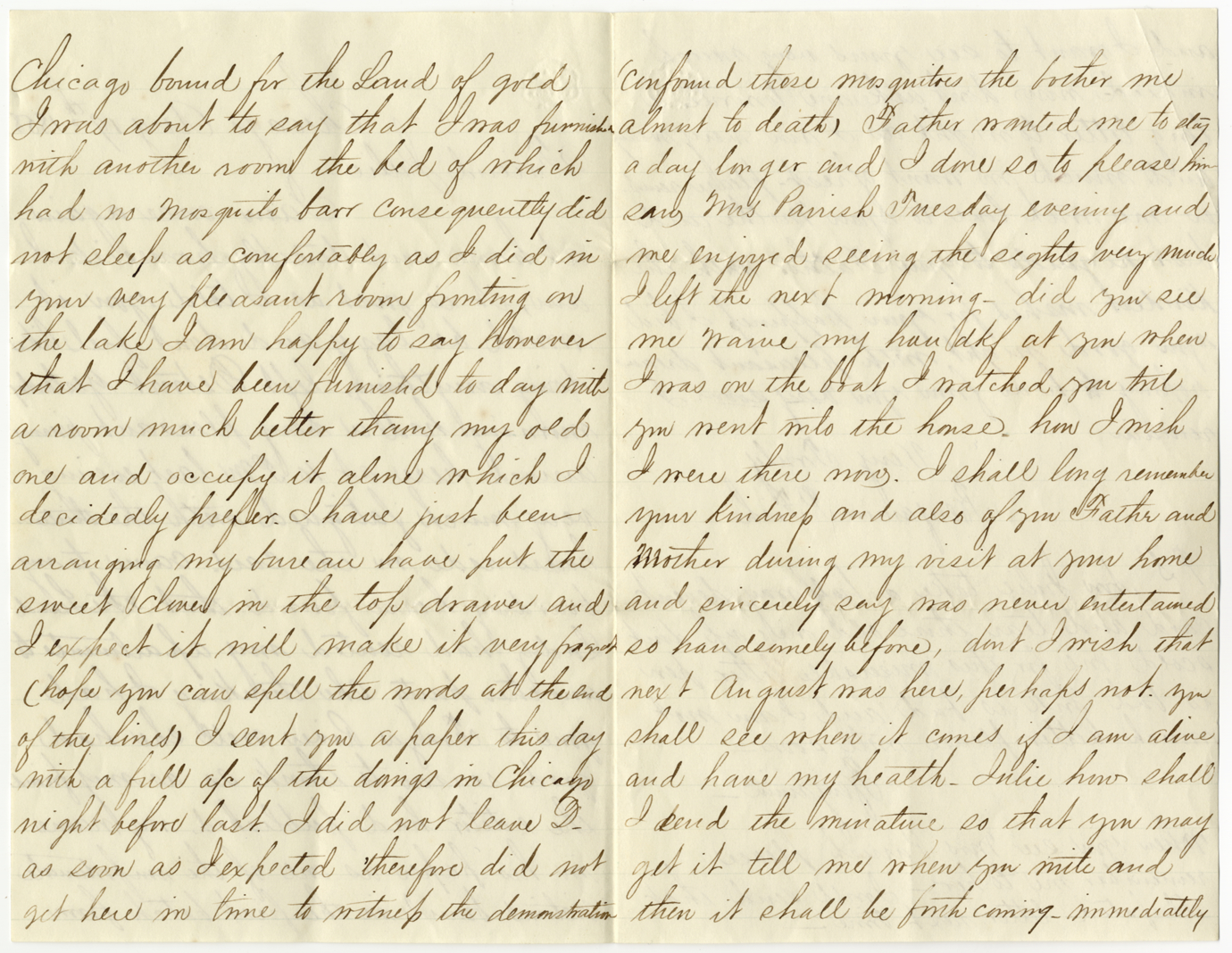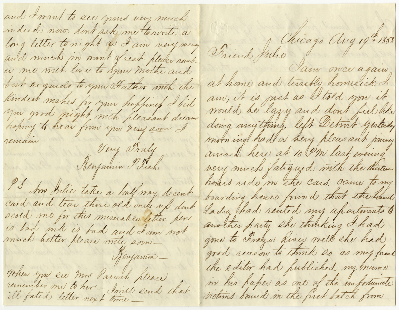 Letter to Julia Smith from Benjamin Fish expressing his gratitude for a recent visit with her family, his travel from Detroit to Chicago, and looking forward to continued correspondence with her.
