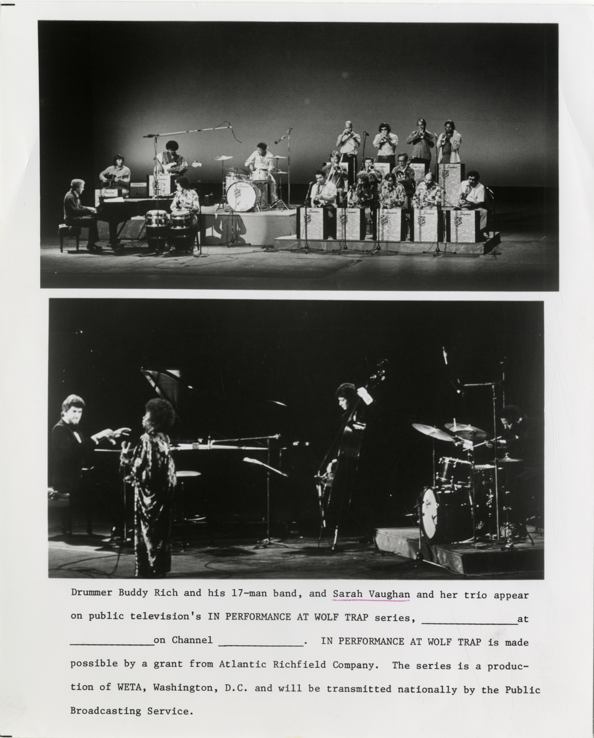 Two views of singer Sarah Vaughan performing with her trio and drummer Buddy Rich performing with his band on the PBS television series, "In performance at Wolf Trap." Printed on front: "Drummer Buddy Rich and his 17-man band, and Sarah Vaughan and her trio appear on public television's 'In performance at Wolf Trap' series, [blank] at [blank] on Channel [blank]. 'In performance at Wolf Trap' is made possible by a grant from Atlantic Richfield Company. The series is a production of WETA, Washington, D.C. and will be transmitted national by the Public Broadcasting Service."