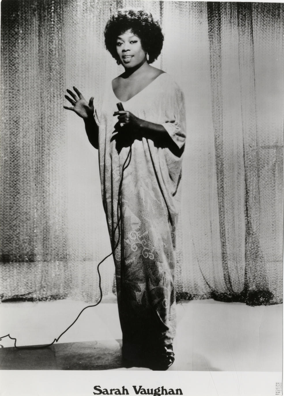 Portrait of singer Sarah Vaughan. Printed on front: "Sarah Vaughan." Handwritten on back: "Vaughan, Sarah, singer."