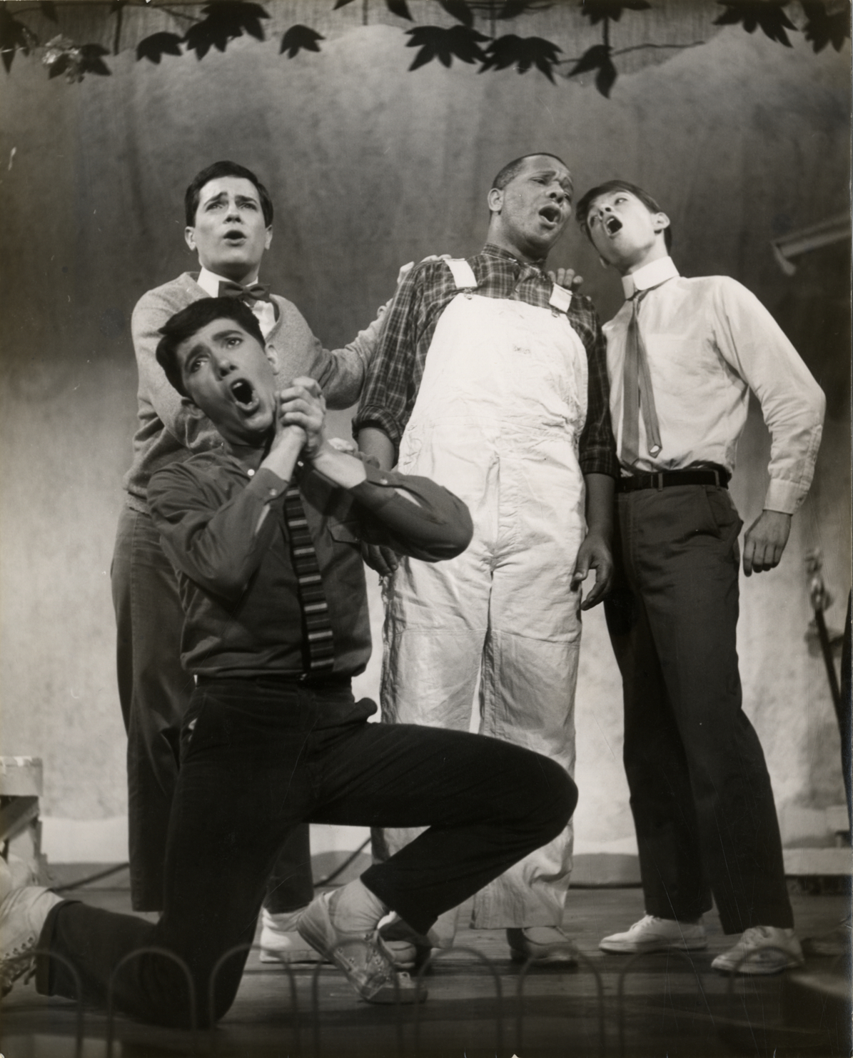 View of singer and actor Laurence Watson with three unidentified actors in a scene from the musical, "Seventeen" at the Equity Library Theatre. Typed on back: "Watson, Laurence." Handwritten on back: "'Seventeen' for Equity Library Theatre, 1960."