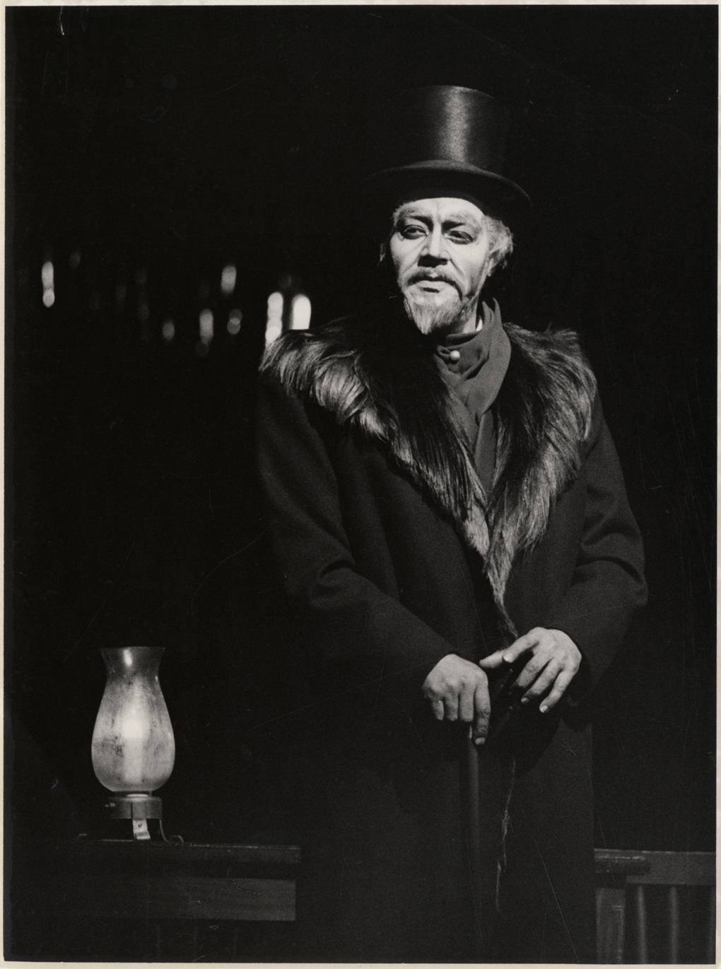 View of baritone Lawrence Winters in Offenbach's opera, "Tales of Hoffmann." Stamped on back: "Copyrightl Reproduktion oder sonst. Veroffentlichung nur gegen Honorarzahlung! Jurgen Simon. Theaterfotografie, (West) Berlin-Charlottenburg, Brixplatz 8." Handwritten on back: "Jacques Offenbach: Hoffmanns Engahlungen. Lawrence Winters (Lindorf, Coppelius, Mirokel, Dappertutto."