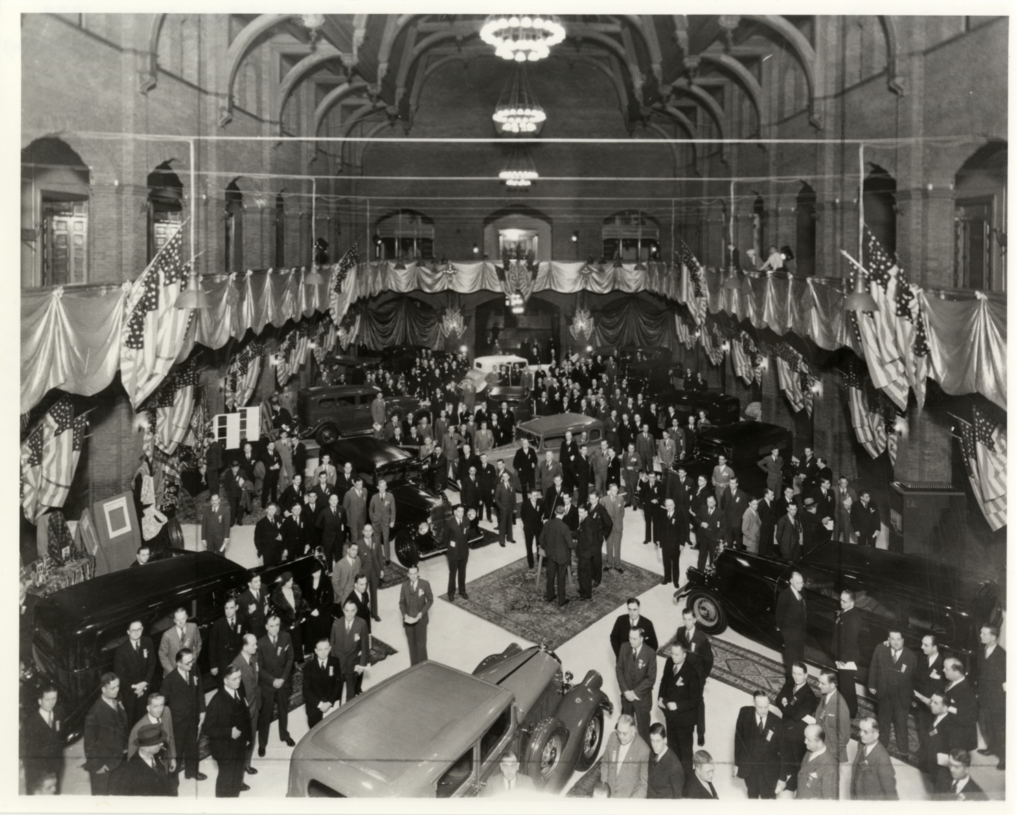 Bird's-eye view of automobile dealers standing on floor of exhibit hall with Pierce-Arrow cars at a 1933 Pierce-Arrow dealers convention. Room is decorated with American flags. Handwritten on back: "1933 Pierce-Arrow dealers convention."