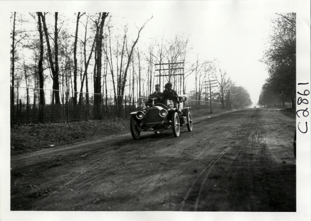 View of motorists in Chalmers car traveling on rural dirt road during the 1909 New York Economy Contest. The one-gallon efficiency contest was sponsored by the New York Automobile Trade Association as part of its second annual automobile carnival. Handwritten on back: "Chalmers, 24 h.p. Tours--New York Economy Contest, 1909."