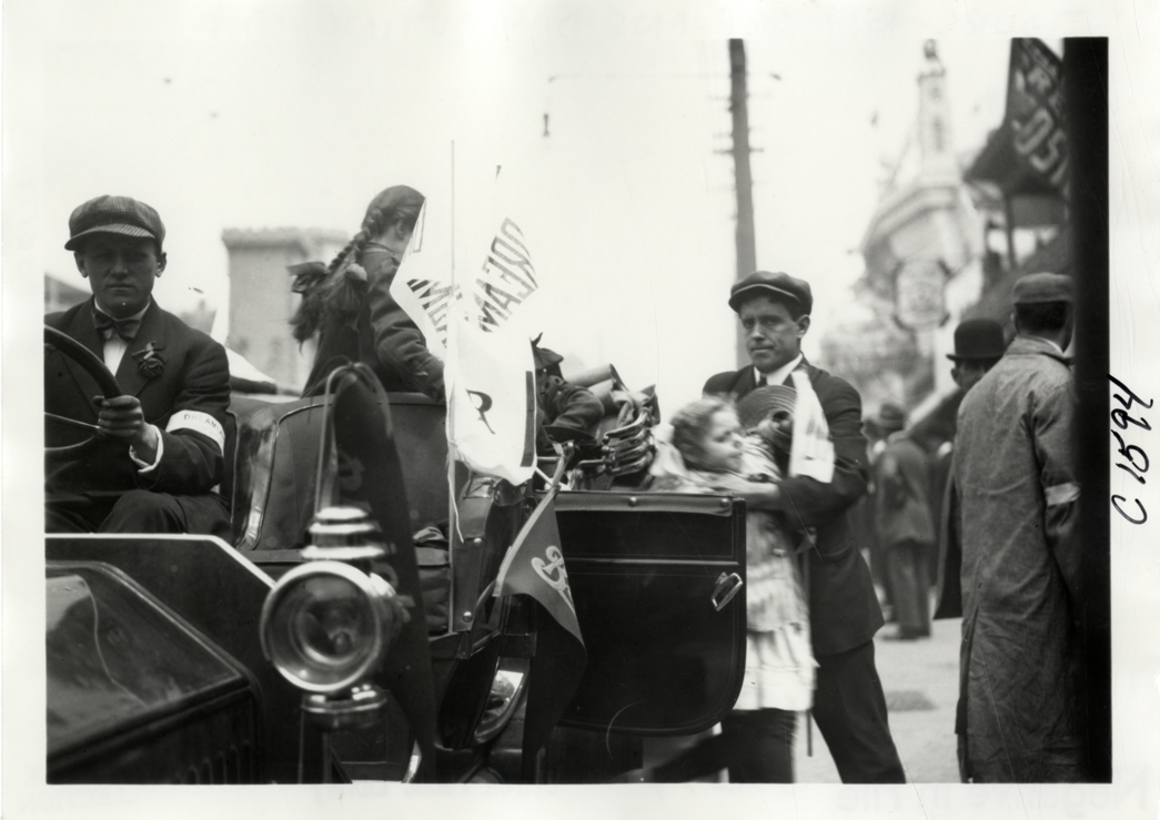 Girls exiting automobile, Coney Island, 1910 New York Orphans Day outing