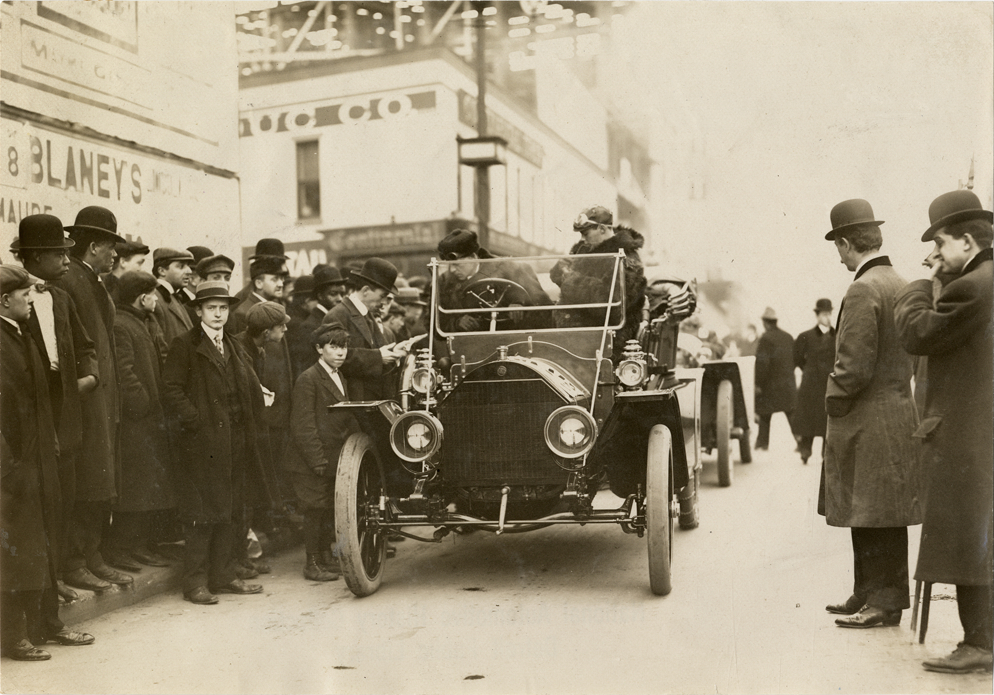 View of motorists in Cadillac car, surrounded by spectators, during the 1909 New York to Boston endurance run. Stamped on back: "Spooner & Wells, Inc., photographers, telephones 3472-3473 Columbus, 1931 Broadway, New York." Handwritten on back: "Cadillac. Tours--New York to Boston Endurance Run, 1909."
