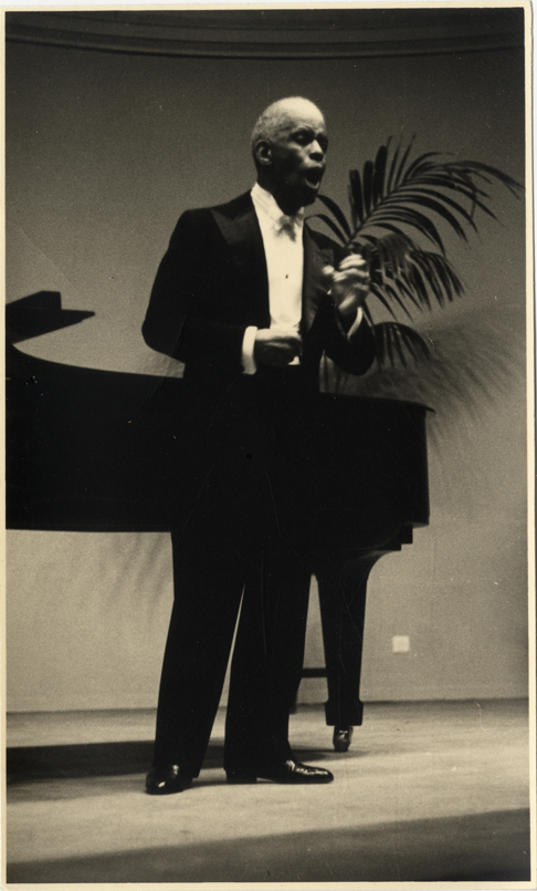 View of tenor Roland Hayes performing in concert. Piano in background. Stamped on back: "Roland Hayes, tenor. The Friedberg Management, 113 West 57 Street, New York 19, N.Y."