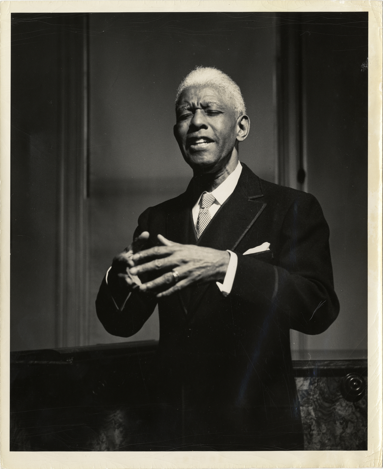 View of tenor Roland Hayes performing in concert. Stamped on back: "Photograph by John Brook, 121A Newbury, Boston 16 USA, please credit."